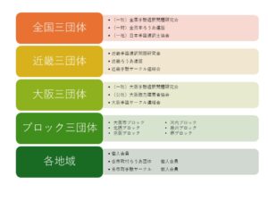 大通研は、聴覚障害者の団体である公益社団法人大阪聴力障害者協会(大聴協)及び大阪手話サークル連絡会(大サ連)と一緒に様々な取り組みを行っています。これらの団体をまとめて「三団体(大阪三団体)」と言います。各ブロックでも三団体で一緒に活動しています。近畿でも三団体活動を行っていますが、サークル連絡会は全国組織がありませんので、全国レベルで三団体と言えば、一般社団法人全国手話通訳問題研究会(全通研)と一般財団法人全日本ろうあ連盟と一般社団法人日本手話通訳士協会の3つのことです。